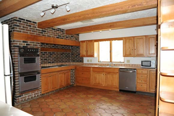 Size: 16'6" x 15'4", Wall Height: 8', Covering: Stucco, Window Treatment: Blinds, Floor Covering: Tile, Pantry: 5'6" x 1'6", Light Fixture: Fluorescent, Counter Top Covering: Laminate with tile backsplash, Sink: Elkay large stainless, Cabinets: Wood with some glass, wine rack and lazy susan.