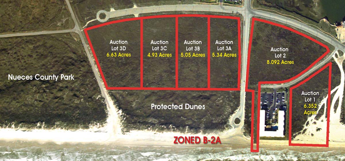Here is a view of 36.394+/- acres with Gulf Frontage on the Gulf of Mexico at Padre Island, Texas. This will be offered in 6 parcels. Click to Enlarge.