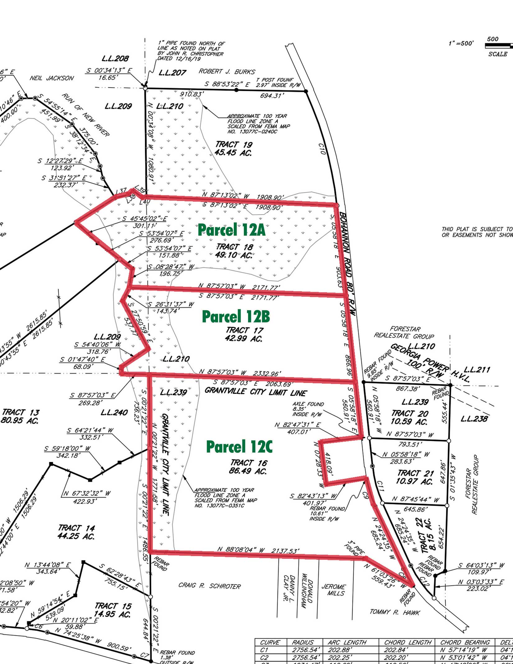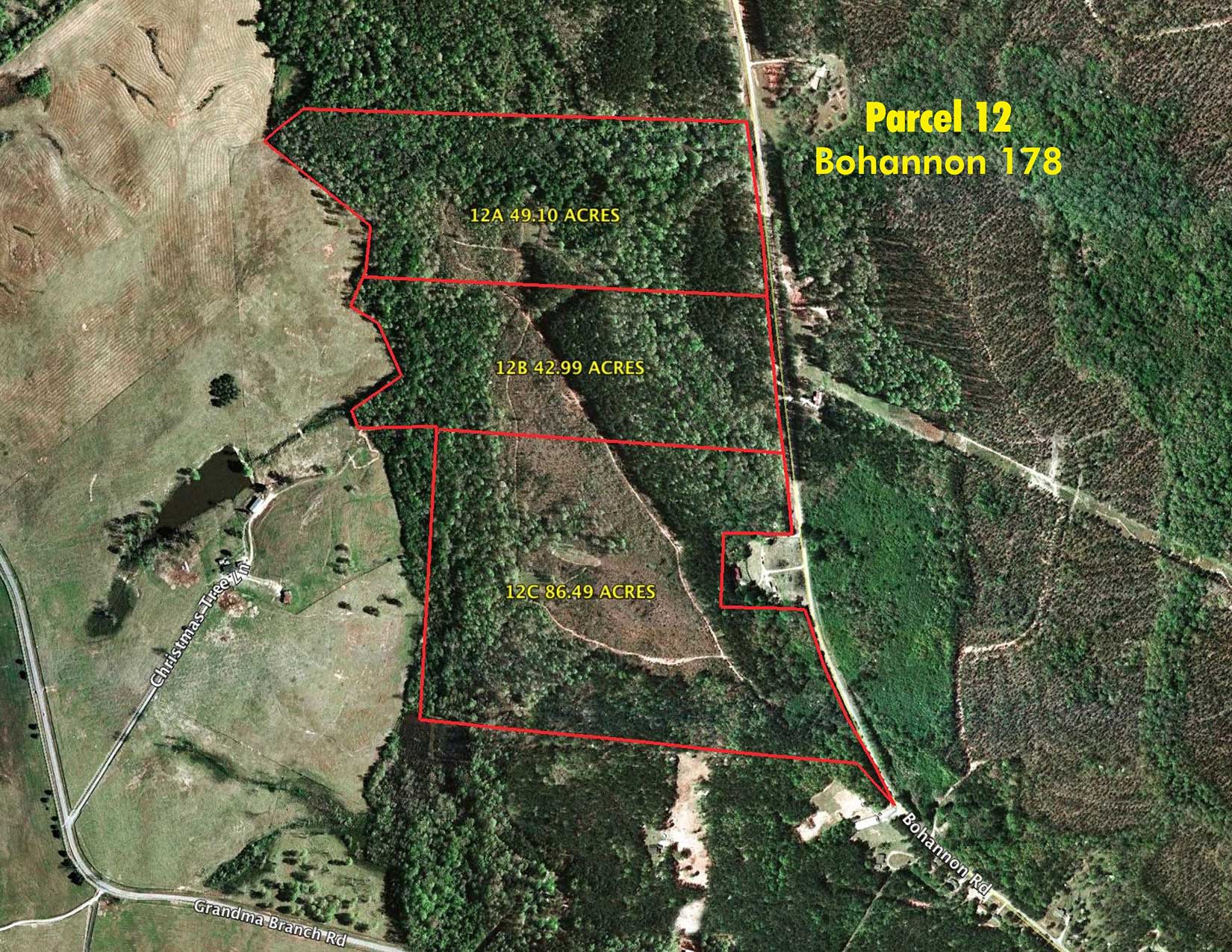 parcels. 12A is 49.10 acres with 903.63 feet of frontage on Bohannon Road. 12B is 42.99 acres with