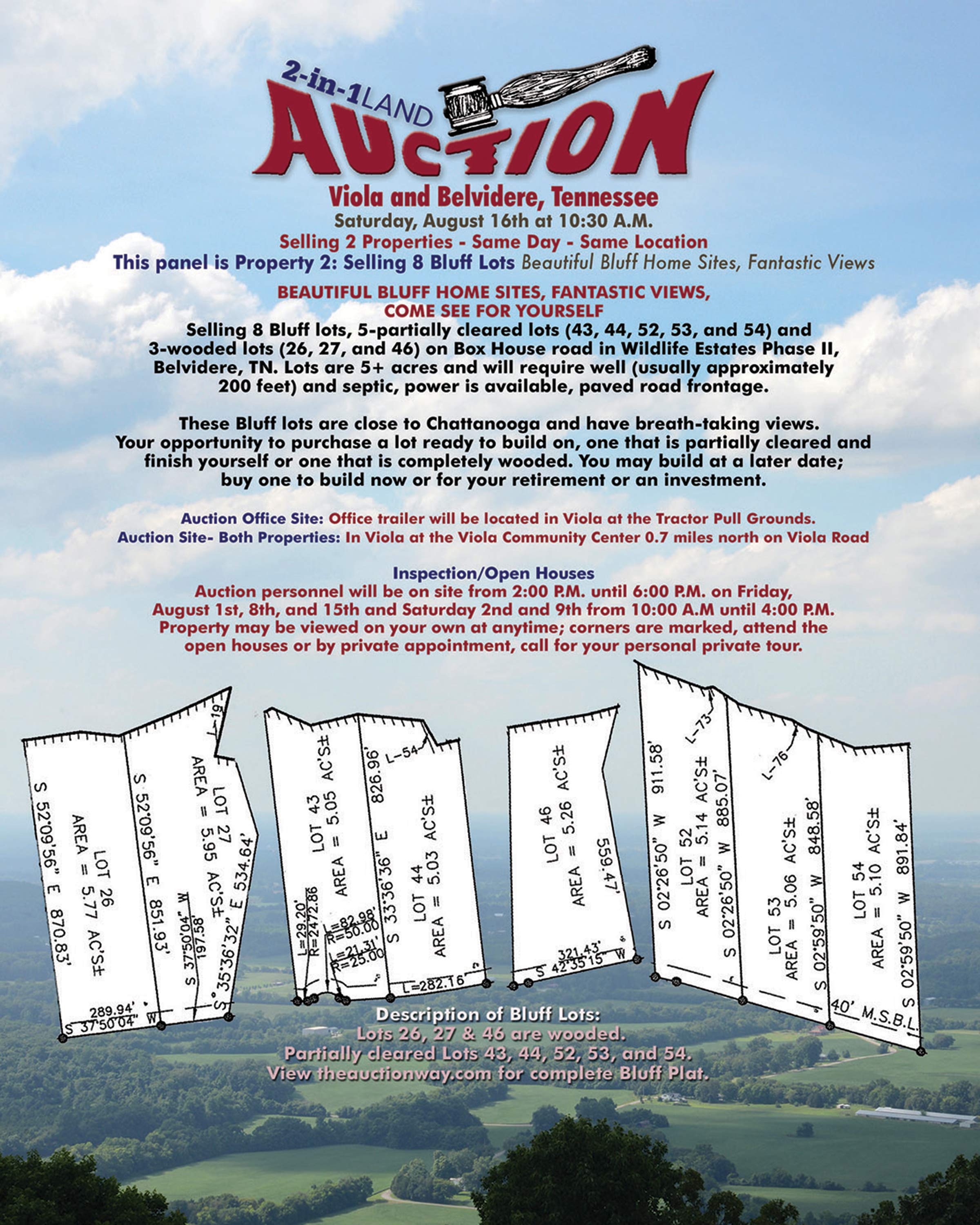 Selling 8 Bluff lots, 5-partially cleared lots (43, 44, 52, 53, and 54)