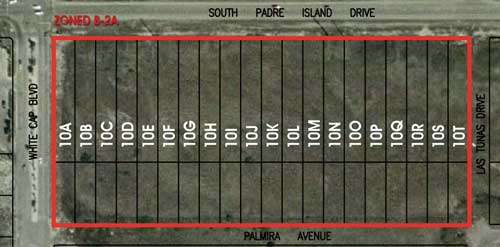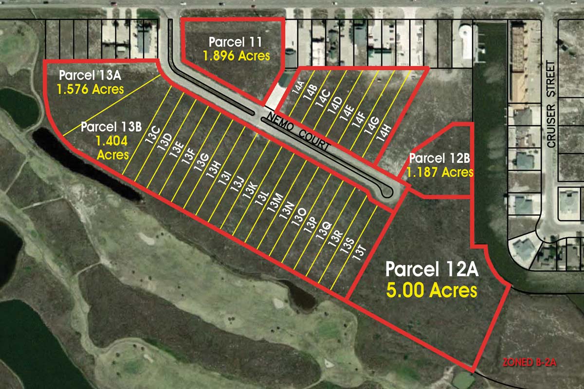Parcels 11 to 14 offer you Commercial and Multi-Family properties that are sandwiched between the major highway on the island - Padre Island Drive and Island Fairway Estates Golf Course. There are over 6 acres on a local water canal. These properties are Mixed-Use at its best. Click to Enlarge.